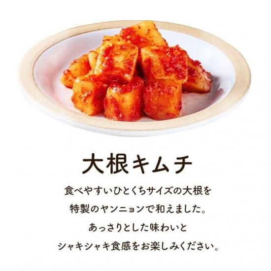 - 白菜(国産)、大根(国産)、人参(国産)、漬け原材料(唐辛子、砂糖、水飴、ニンニク、りんご、食塩、鰹節エキス、生姜、エビパウダー、昆布)/調味料(アミノ酸)、(一部にりんご・えびを含む)