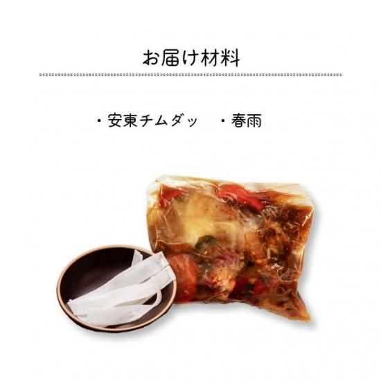 - チムダッ(鶏肉(国産)、玉ねぎ、ジャガイモ、人参、水飴、醤油、青唐辛子、砂糖、チュンジャン、粉末牛骨エキスパウダー、ニンニク、生姜、焼酎、唐辛子、コショウ)、春雨/調味料(アミノ酸等)、香料、酸味料、香辛料抽出物、(一部に小麦・乳成分・牛肉・大豆・鶏肉を含む)